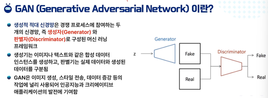 - 생성적 적대 신경망(GAN)은 두 개의 신경망으로 구성된 구조입니다. 하나는 생성자(Generator) 로, 새로운 데이터 인스턴스를 생성하는 역할을 합니다. 다른 하나는 판별자(Discriminator) 로, 생성자가 만든 데이터와 실제 데이터를 구별하는 역할을 합니다. 생성자와 판별자는 서로 경쟁하면서 학습을 진행하게 되는데, 이 과정을 통해 생성자는 점점 더 현실적인 데이터를 생성하게 됩니다.