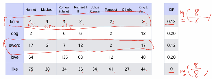 TF-IDF 에서 로그의 N/D는 (전체 문서 개수)/(나온 문서 개수)이다.