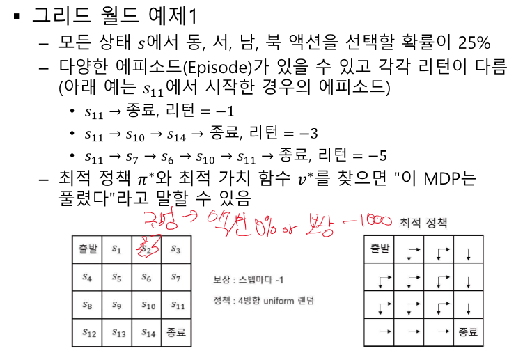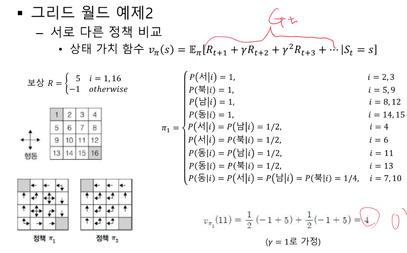 상태 가시 함수 : 특정 정책에 따른 위치의 가치를 평가하여 높은 가치의 상태로 진행하려고 한다.