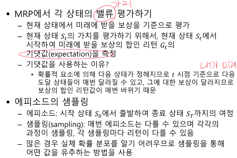 내가 미래에 무엇을 받을 지 모르니 기댓값을 사용하여 확률로만 알 수 있게 된다.