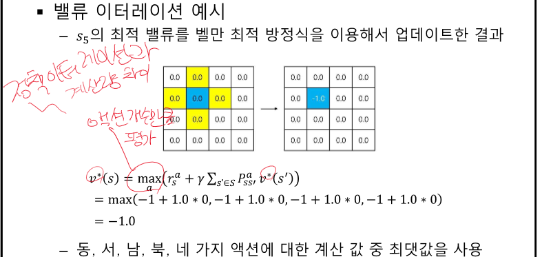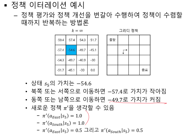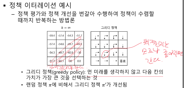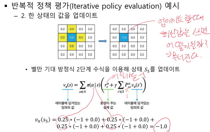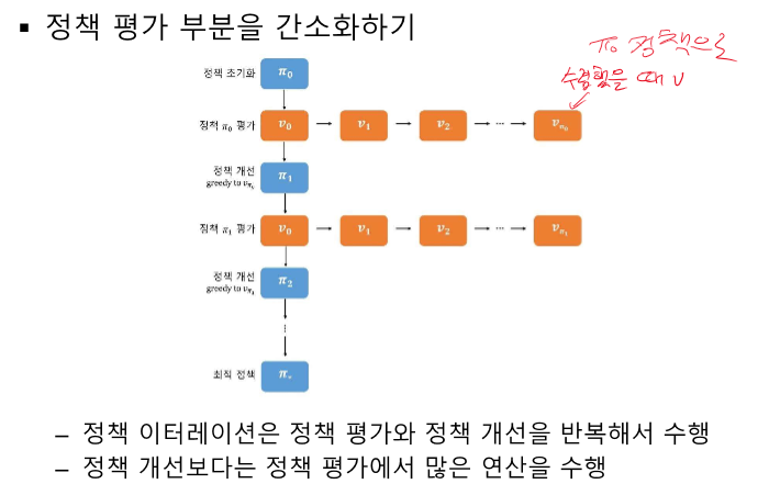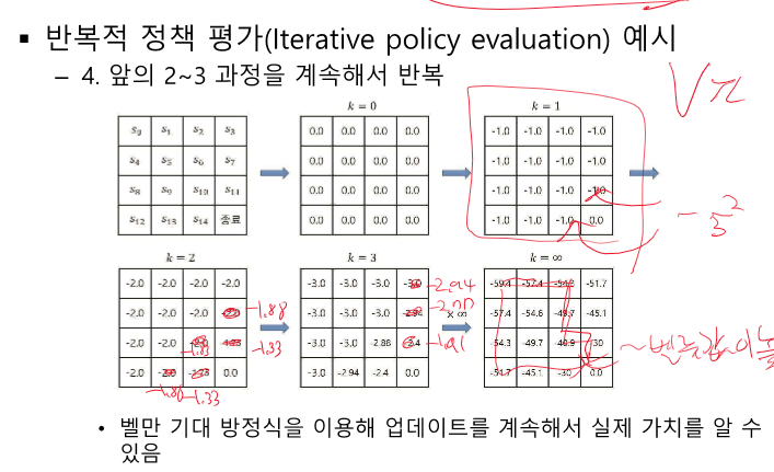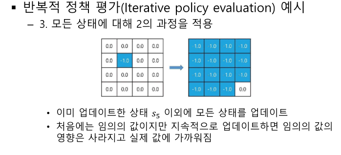 여기선 특정 정책에 대해 계속 평가한다. 모든 V를 계산하면 특정 정책을 취했을 때 알 수 있다.