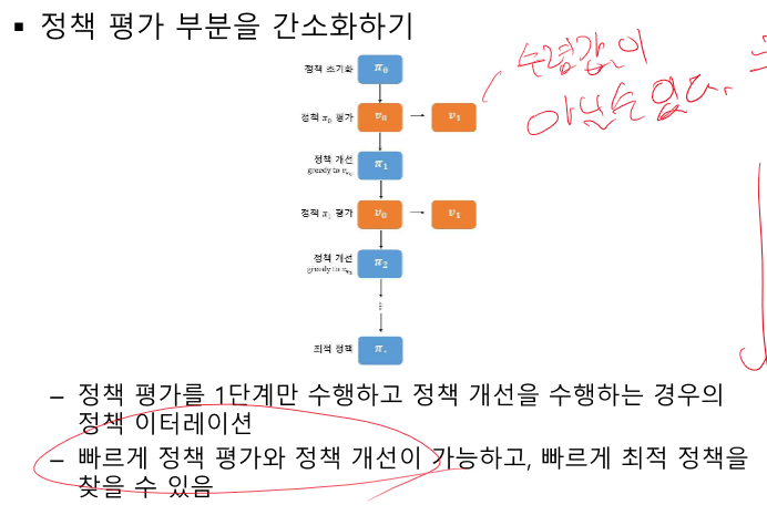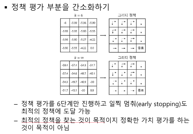 수렴값이 아니기 때문에 초창기 정책에 문제가 생길 수 있지만 반복하다보면 셋을 줄이며 경우의 수를 줄여 잘 찾는다.
