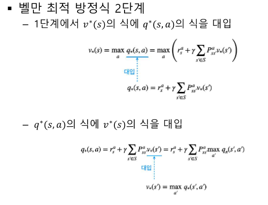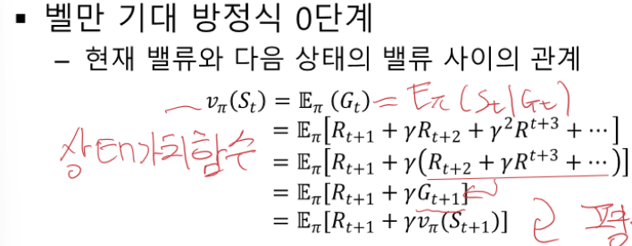 벨만 방정식 - t와 t+1사이의 v의 관계를 다루며 v와 정책 함수 사이의 관계도 다룬다.
