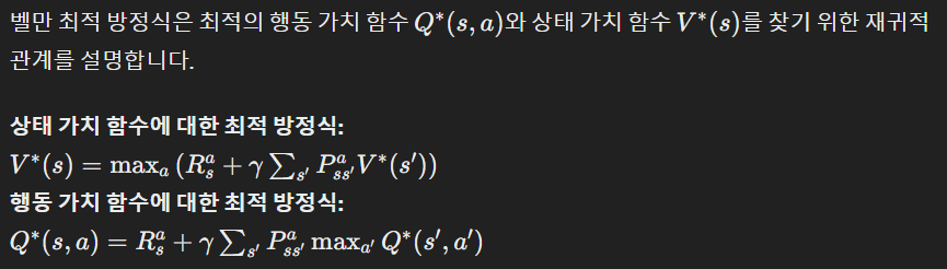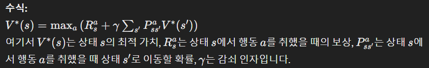 벨만 최적 방정식은 강화학습에서 최적의 정책을 찾기 위한 재귀적인 관계를 나타냅니다. 이 방정식은 각 상태에서 취할 수 있는 모든 가능한 행동 중에서 가장 높은 기대 리턴을 제공하는 행동을 선택함으로써, 최적의 상태 가치 함수를 계산합니다.