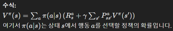 벨만 기대 방정식은 주어진 정책 (\pi)에 대해 각 상태의 가치 함수를 계산하는 데 사용됩니다. 이 방정식은 선택된 정책 하에서 각 상태의 기대 가치를 계산합니다.
