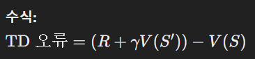 TD 학습은 부트스트래핑 방법을 사용하여, 현재의 추정을 기반으로 한 스텝 후의 가치를 사용해 업데이트합니다. TD 오류는 예측 가치와 실제 받은 보상 및 다음 추정 가치 사이의 차이를 나타냅니다.