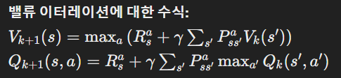 밸류 이터레이션은 각 상태의 최적 가치를 직접적으로 계산하고, 이를 통해 최적의 정책을 간접적으로 도출하는 방법입니다. 이 방법은 벨만 최적 방정식을 반복적으로 적용하여 수행됩니다.