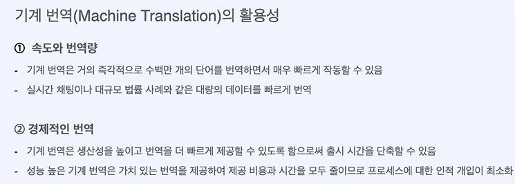 전문적인 번역가한테 기계번역이 좋은 프로토 타입이 되어 생산성 향상에 도움이 될 수 있다.