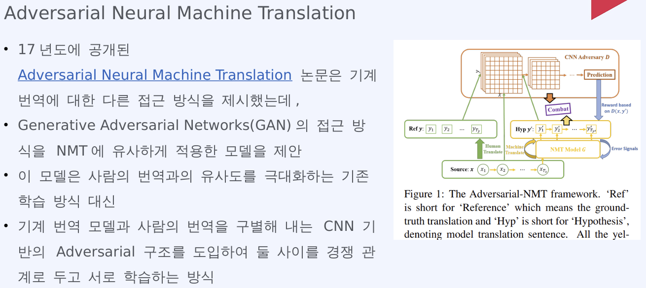 판별자와 생성자의 싸움 구조인데 학습 방식을 가지고 와서 기계번역과 사람 번역을 구분해 계속 평가하도록 한다.