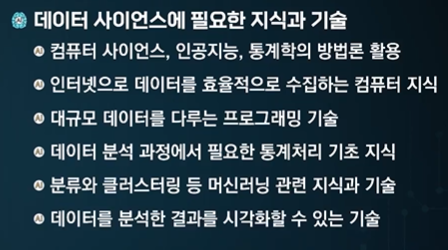 데이터 분석, 수집, 결과를 다 해야 하므로 통찰력, 최신 기술, 통계적 지식도 필요하다