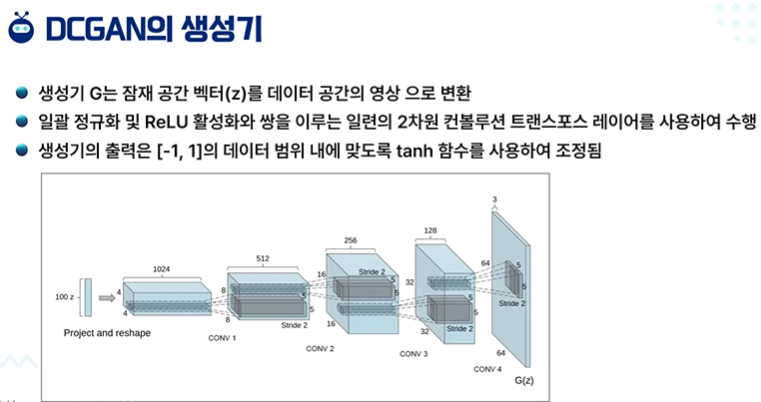 DCGAN (Deep Convolutional Generative Adversarial Network) 은 컨볼루션 신경망을 사용하여 GAN의 안정성을 향상시킨 모델입니다. DCGAN에서는 다음과 같이 생성기와 판별기가 구성됩니다:
