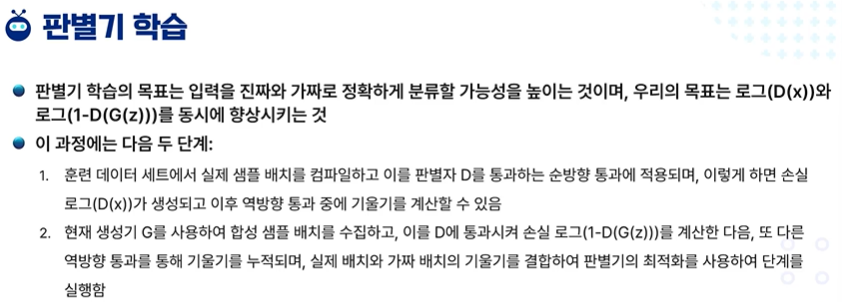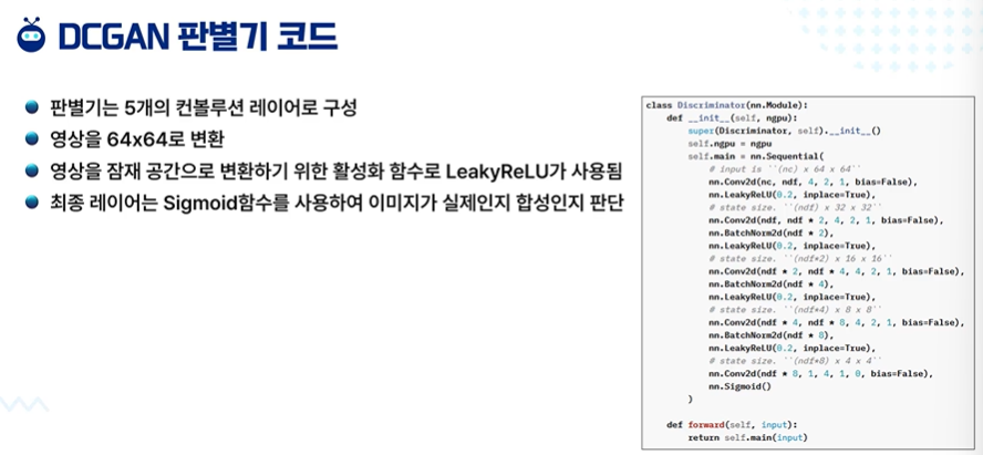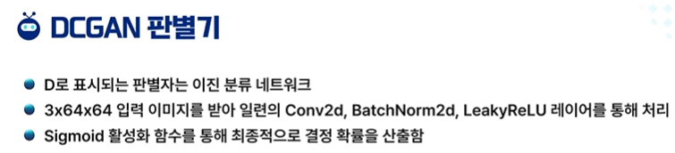 transpose convolution(역 컨볼루션 또는 프랙셔널 컨볼루션) 레이어를 사용하여 차원을 확장합니다. - 판별기 (Discriminator): 입력받은 이미지가 진짜인지 가짜인지를 판별합니다. 일반적인 컨볼루션 신경망 구조를 사용하여 이미지를 점점 작은 차원의 특성으로 압축하고, 마지막에는 하나의 스칼라 값 (진짜 혹은 가짜를 나타내는 확률)을 출력합니다.