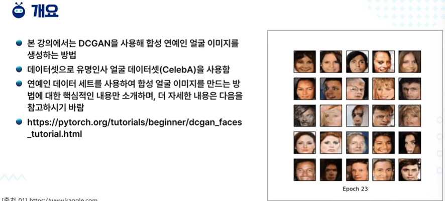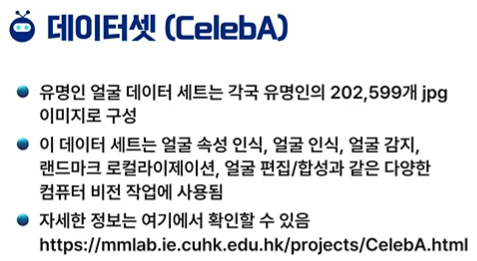 CelebA (Celebrity Faces Attributes) 데이터셋은 대규모 얼굴 속성 데이터셋으로, 10,177명의 유명인의 얼굴 이미지 202,599개로 구성되어 있습니다. 이 이미지들은 다양한 포즈와 배경을 가지며, 40개의 얼굴 속성에 대한 레이블이 포함되어 있습니다. 이 데이터셋은 얼굴 인식, 얼굴 특징 검출, 랜드마크(또는 키포인트) 위치 인식 등의 연구에 널리 사용되며, GAN을 통한 얼굴 이미지 생성 연구에도 자주 활용됩니다.