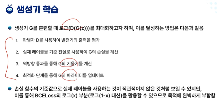 - Binary Cross Entropy (BCE) Loss: 일반적으로 판별기에서는 진짜 이미지에 대해서는 1, 가짜 이미지에 대해서는 0의 값을 목표로 하는 BCE 손실 함수를 사용합니다. 생성기에서는 판별기가 생성한 가짜 이미지를 진짜로 판단하도록 만드는 것이 목표입니다.