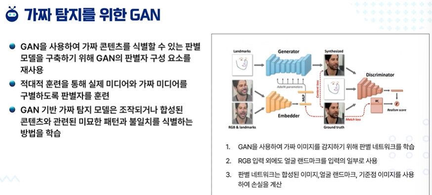 GAN은 두 개의 네트워크, 생성기(Generator)와 판별기(Discriminator)로 구성됩니다. 가짜 탐지에 GAN을 사용할 때의 주된 접근 방식은, 판별기를 훈련시켜 진짜 데이터와 가짜 데이터를 구분하게 하는 것입니다. 이 과정은 다음과 같습니다: