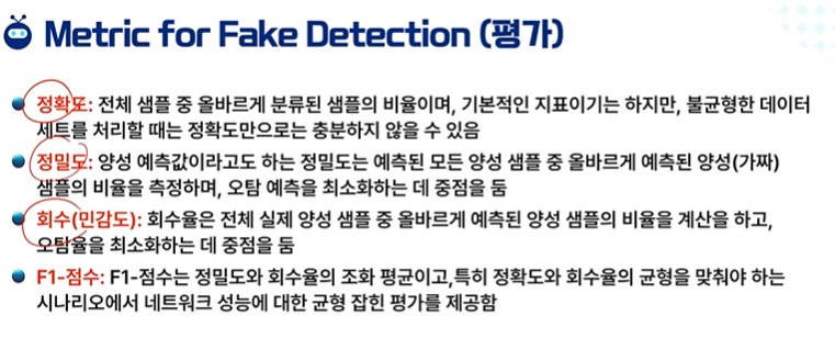 이러한 지표들은 모델이 얼마나 잘 가짜를 탐지하는지, 그리고 잘못된 판단을 하는 비율이 얼마나 되는지를 정량적으로 보여줍니다. 각 평가 지표는 특정 애플리케이션의 요구에 따라 다르게 중요시될 수 있습니다. 예를 들어, 보안이 중요한 환경에서는 가짜를 놓치지 않는 것이 매우 중요할 수 있어, 높은 재현율이 요구될 수 있습니다.