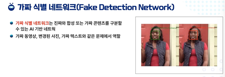 “가짜 식별 네트워크는 진짜와 합성 또는 가짜 콘텐츠를 구분할 수 있는 AI 기반 도구이며, 가짜 동영상, 변경된 사진, 가짜 텍스트와 같은 문제에서 이러한 네트워크는 큰 역할을 함”
