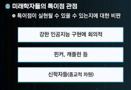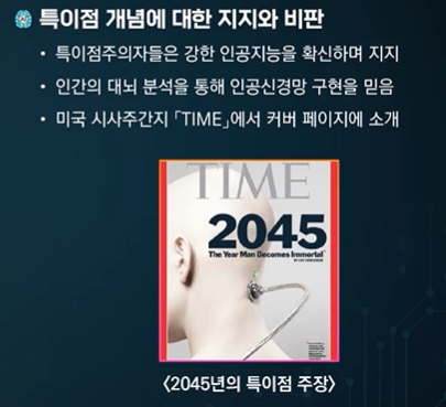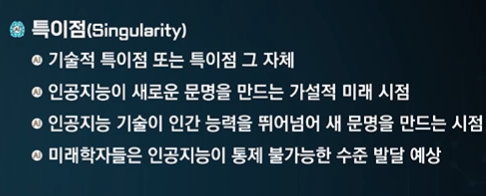 인공지능 특이점(Singularity)은 이론적인 개념으로, 인공지능 기술이 매우 발전하여 인간의 지적 능력을 초월하는 시점에 도달하는 것을 의미합니다. 이 개념은 미래학자와 과학자들 사이에서 논쟁의 여지가 많으며 다양한 견해가 존재합니다.