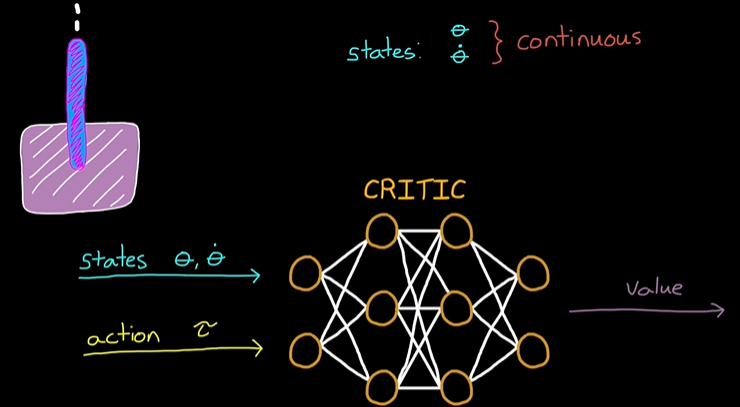 이 아이디어를 각도와 각속도의 두 가지 상태가 있는 역진자로 확장해 보겠습니다. 단, 이제 상태는 연속적입니다. 값 함수는 조회 테이블을 제외하고 연속 상태 공간을 처리할 수 있습니다. 그래서 우리는 신경망이 필요합니다. 아이디어는 동일합니다. 상태 관찰과 동작을 입력하면 신경망이 값을 반환합니다.