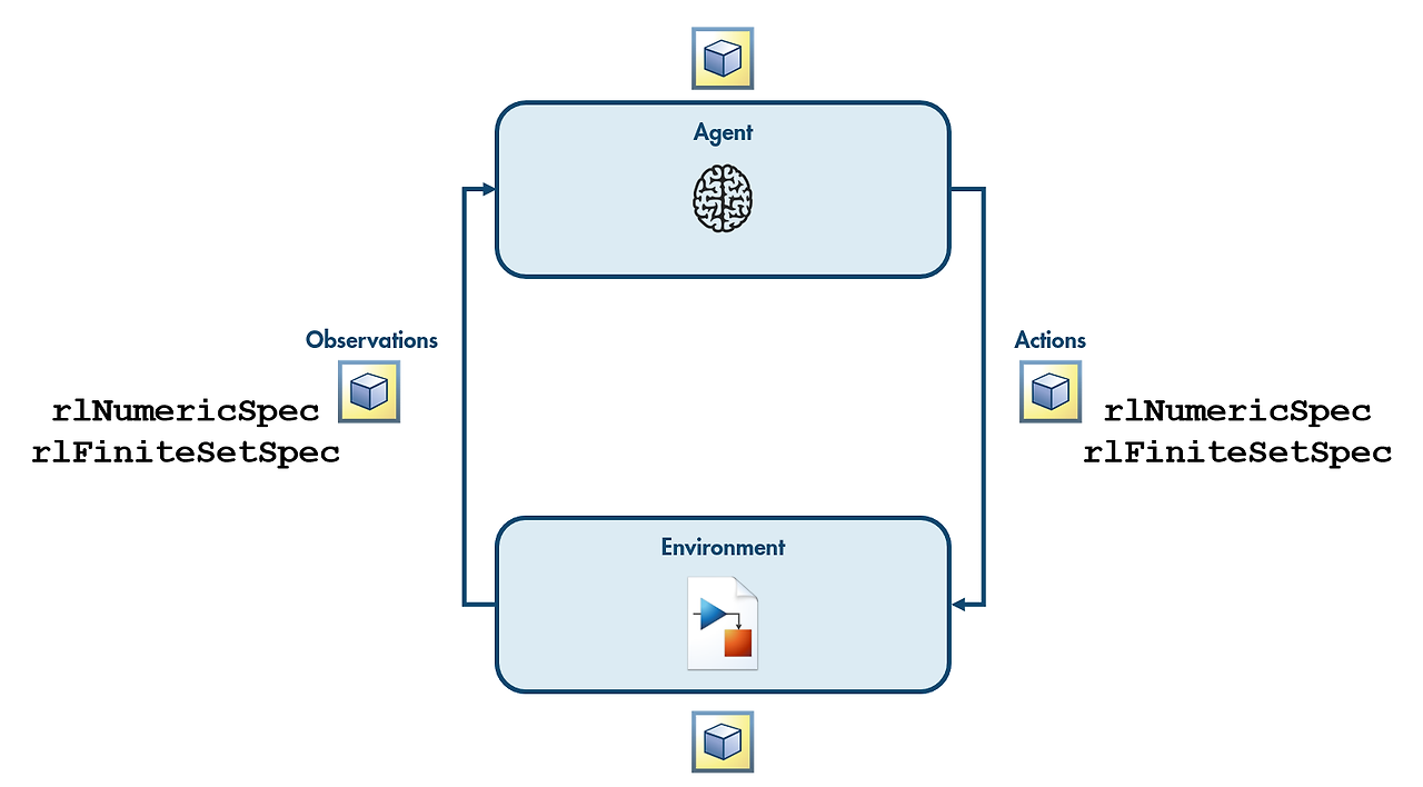 에이전트, 환경, 관측값, 행동은 모두 MATLAB에서 변수로 표현됩니다.관측값과 행동을 정의할 방법을 지정하려면 rlNumericSpec 함수 또는 rlFiniteSetSpec 함수를 사용합니다.