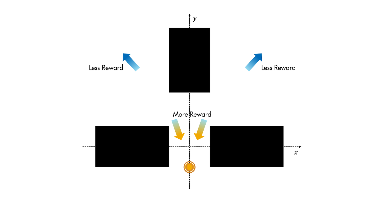 보상 함수는 로봇이 선반 사이의 공간 쪽( (x,y)=(0,0))으로 이동한 다음 틈새를 통해 아래쪽( y<0)으로 이동하도록 장려해야 합니다.