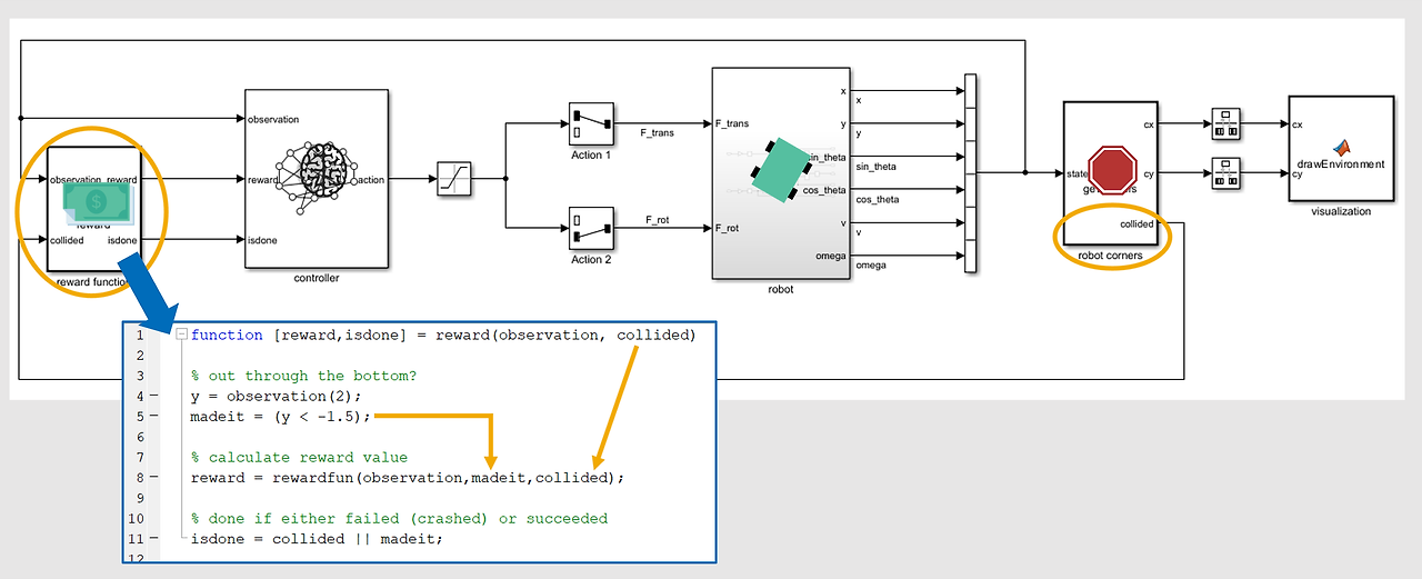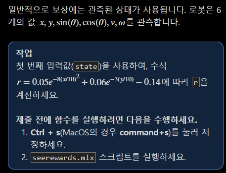 robot corners 블록은 로봇의 물리적 이동 범위를 확인하고, 그 범위를 기준으로 충돌의 발생 여부도 확인합니다. 이 정보가 reward function 블록에 전달되면, 이 블록은 관측된 상태를 사용하여 로봇의 목표 도달 여부를 확인합니다. 관측된 상태와 두 가지 종료 조건에 대한 정보가 MATLAB 함수 rewardfun에 전부 전달됩니다. 이 활동에서는 이 함수를 작성하여 보상을 계산해 보겠습니다.