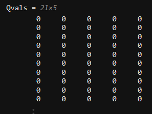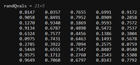rand 함수를 사용하여 무작위 Q 값으로 구성된 21 ×5 행렬을 만드세요. 이 행렬을 randQvals라는 변수에 저장하세요.