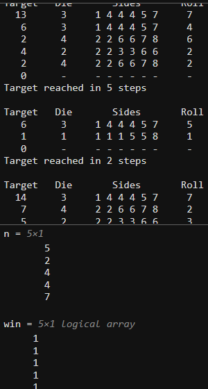 명령 [n,win] = playdice(agent, slEnv)를 사용하여, 방금 만든 에이전트로 주사위 게임을 시뮬레이션하세요.