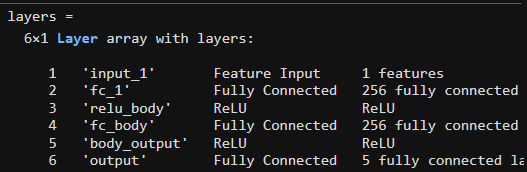 변수 defaultnet은 디폴트 DQN 에이전트에 대한 크리틱 신경망을 포함하고 있습니다. 신경망 변수의 Layers 속성은 신경망의 계층으로 구성된 배열을 보관하고 있습니다.