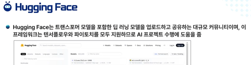 “Hugging Face는 트랜스포머 모델을 포함한 딥 러닝 모델을 업로드하고 공유하는 대규모 커뮤니티이며, 이 프레임워크는 파이토치와 텐서플로를 모두 지원하므로 AI 프로젝트를 더 빠르게 개발할 수 있음”