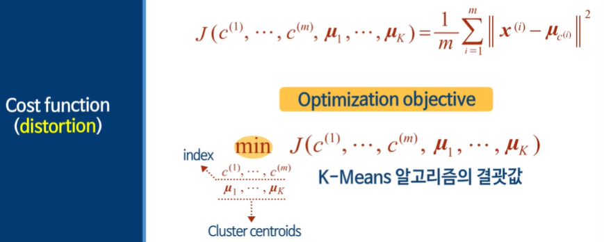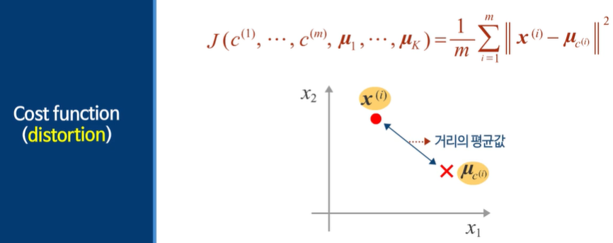 비용함수는 다른 말로 distortion이라고 부른다. 제곱의 평균이다!
