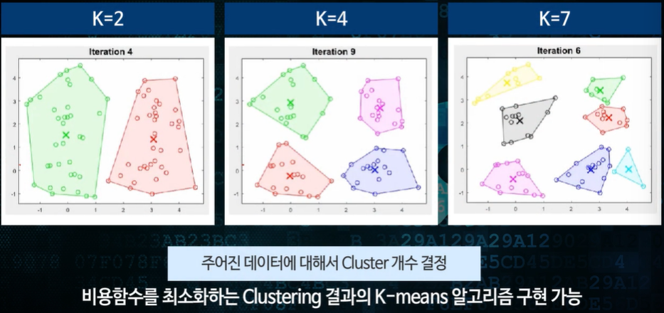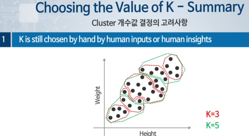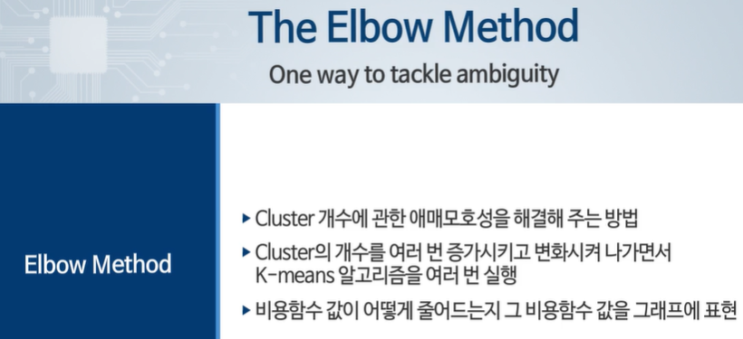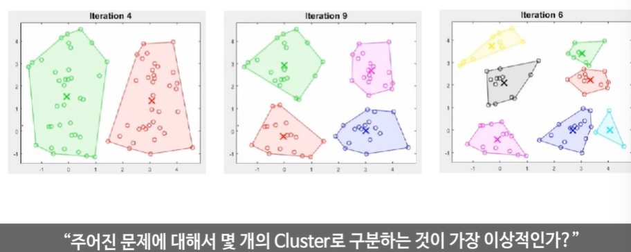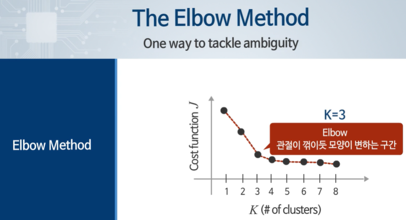 3인경우 까지는 비용함수가 큰 폭으로 줄어드나 그 이후로는 큰 폭으로 줄지 않았다.