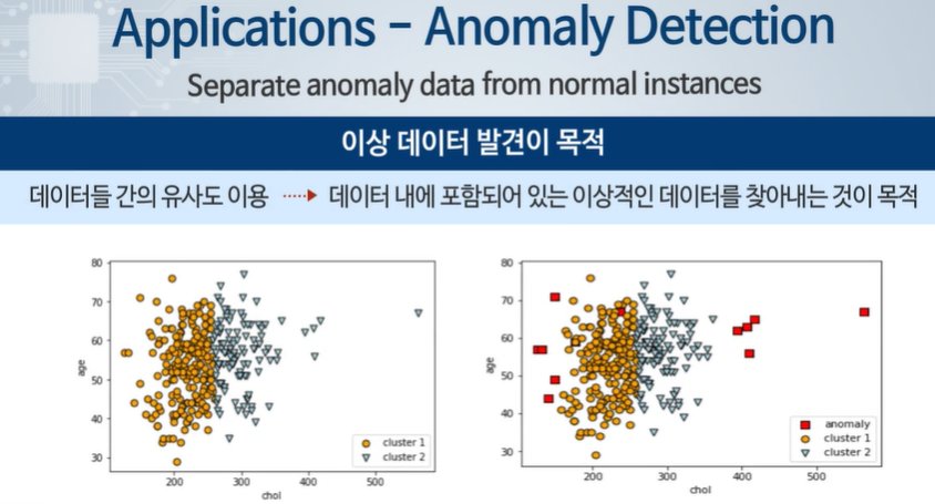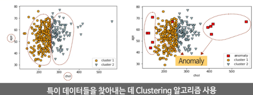 의료 진단에서 지금까지 알지 못했떤 새로운 종류의 증세/ 병의 종류, 정상 범위에서 벗어나는 환자를 찾는 데 사용이 될 수 있다.