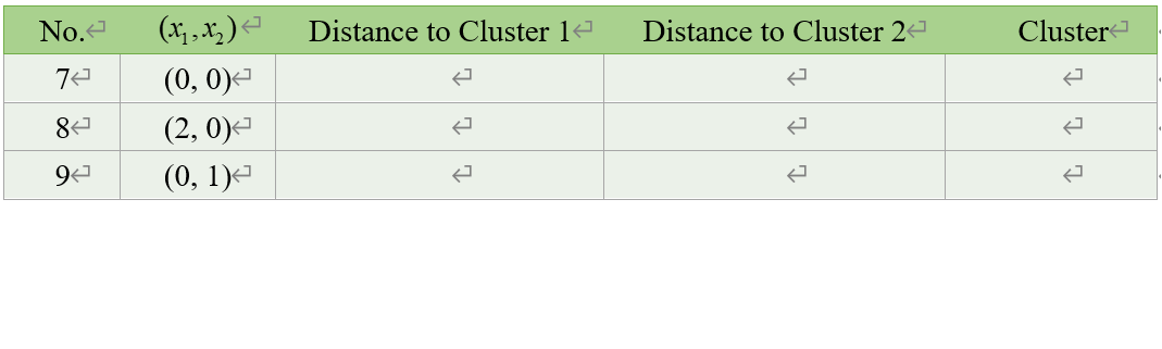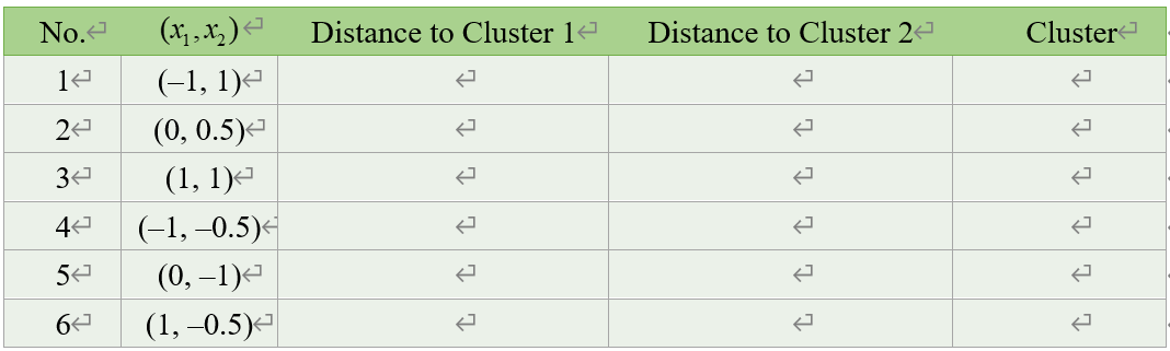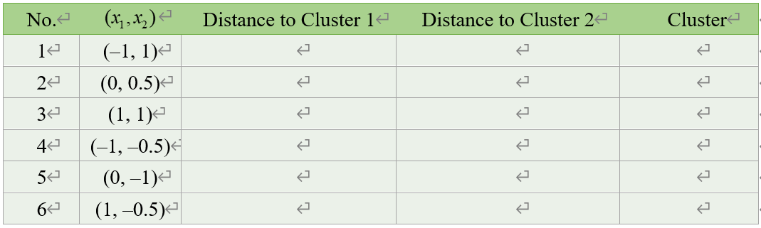 (1) 데이터들과 클러스터 중심의 초기값들을 2차원 특징 공간 상에 함께 표시하고, 각 데이터 포인트들이 어느 클러스터에 속하는지 판단하여 다음 표를 완성하시오: