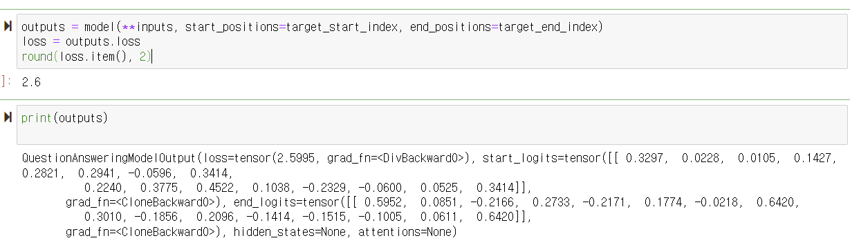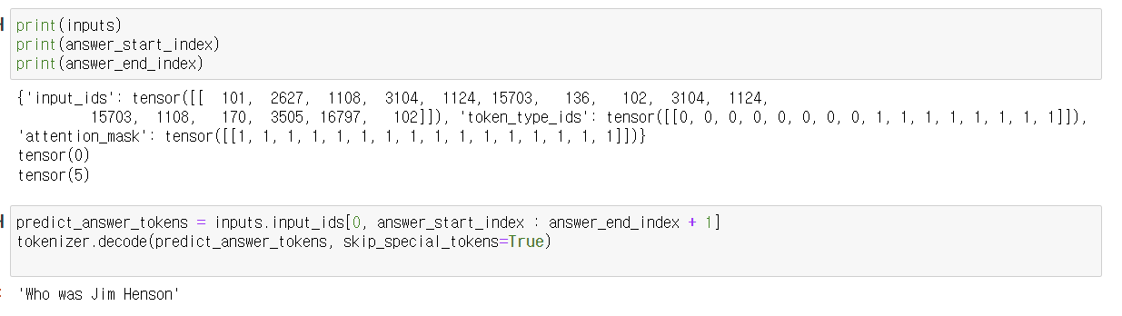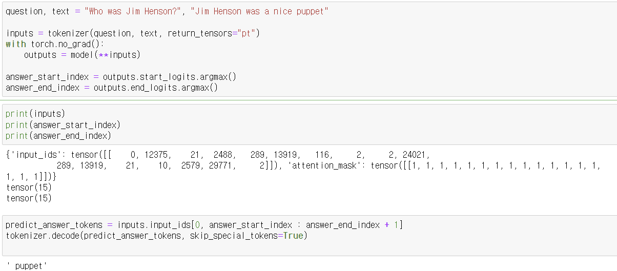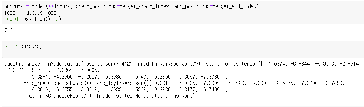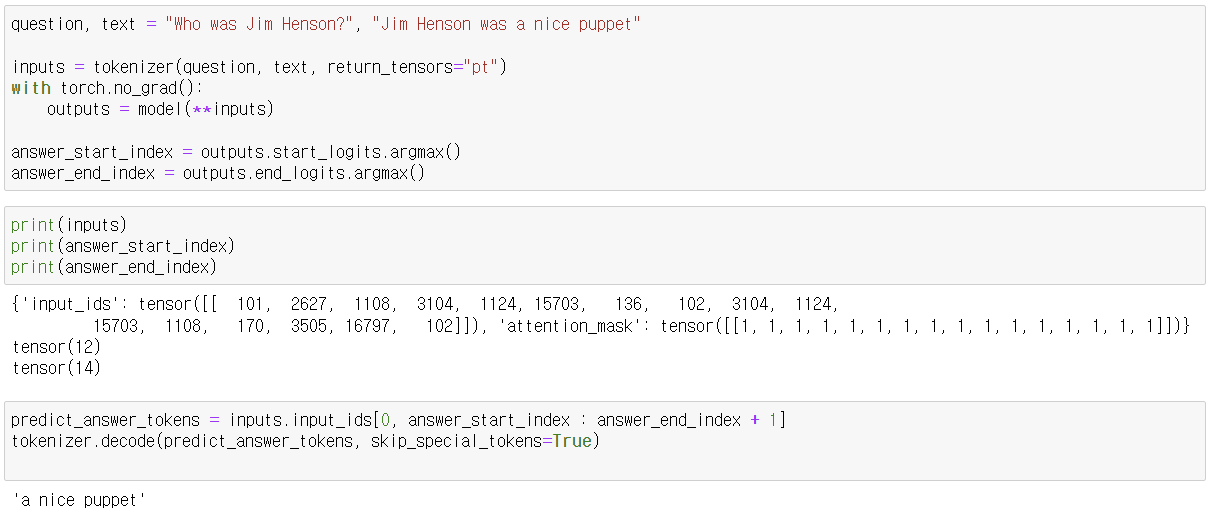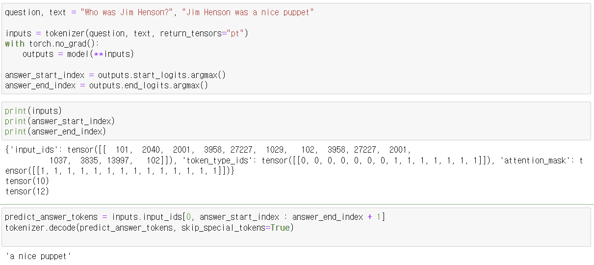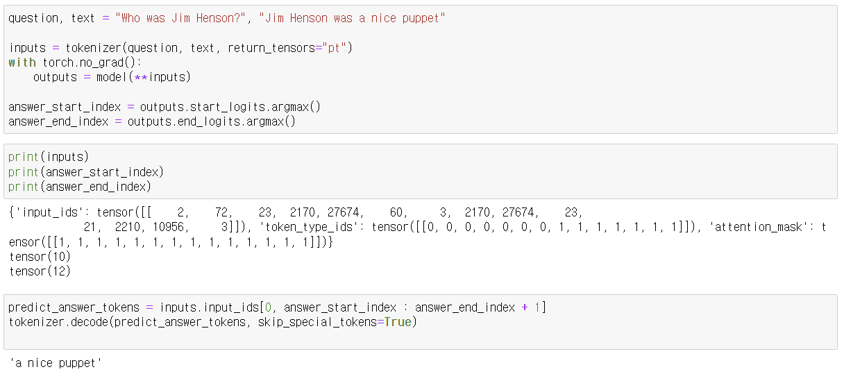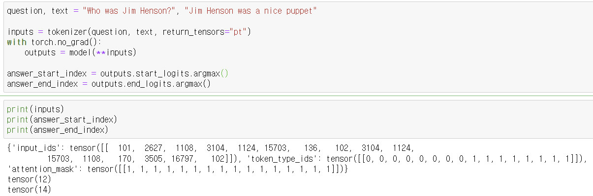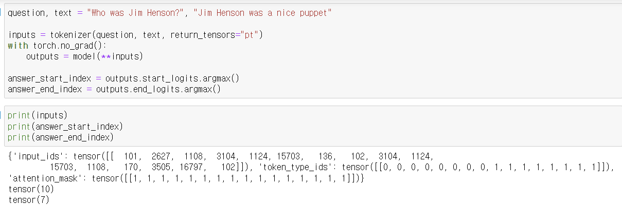 - tokenizer를 사용하여 질문과 텍스트를 토큰화하고, PyTorch 텐서 형식으로 변환합니다.