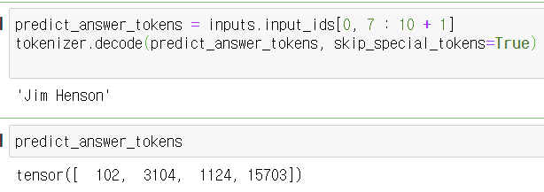- 예측된 답변의 시작과 끝 인덱스를 찾기 위해 로짓(logits)의 argmax를 계산합니다.