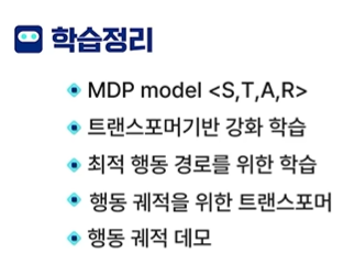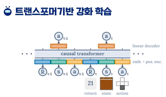 이번 강의에서는 강화학습 리뷰, 판단 트랜스포머, 행동 생성용 트랜스포머,