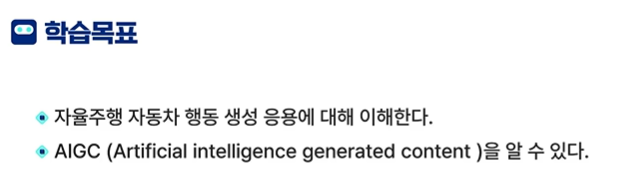 강의를 통해서 여러분은 자율주행 생성 모델, 자율주행 생성 모델 훈련 장점, 자율주행 행동 생성을 설명할 수 있고,