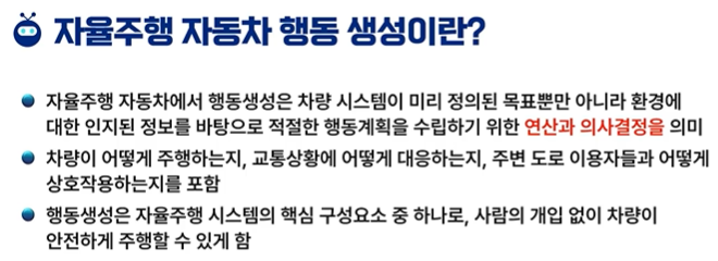 “자율주행 자동차에서 행동생성은 차량 시스템이 미리 정의된 목표뿐만 아니라 환경에 대한 인지된 정보를 바탕으로 적절한 행동계획을 수립하기 위한 연산과 의사결정을 의미한다.”