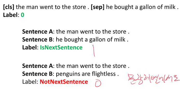 NSP (Next Sentence Prediction) : classification과 같은 느낌으로 이 두 문장이 이어지냐, 안 이어지냐를 맞춘다.