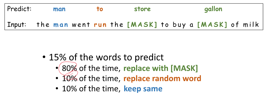 mask만 하는 것이 아니라 랜덤한 단어로 변경하기도 한다.