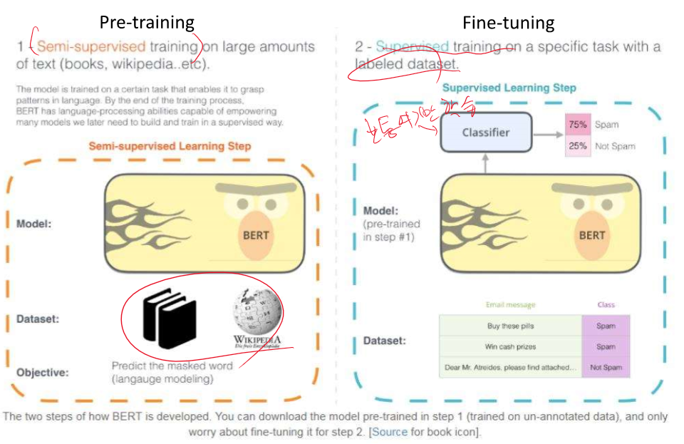 - BERT의 사전 훈련 데이터셋으로 사용된 주요 소스는 __와 __이다. (BookCorpus, 영어 위키피디아)