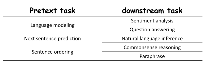 - Pretext Tasks in NLP: 언어 모델링, 다음 문장 예측, 문장 순서 정렬 등이 있음.