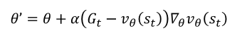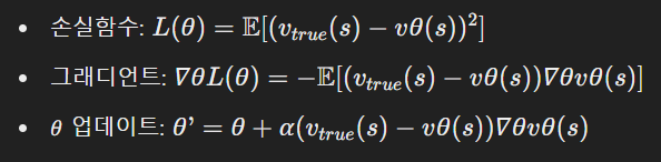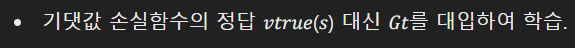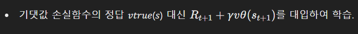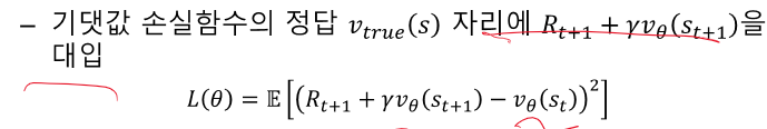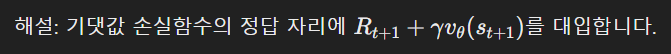 - 해설: 기댓값 손실함수의 정답 자리에 (R_{t+1} + \gamma v_\theta(s_{t+1}))를 대입합니다.