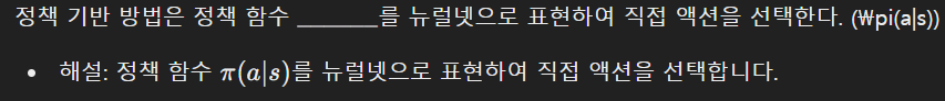 - 해설: 정책 기반 방법은 뉴럴넷을 사용하여 정책 함수를 표현하고 직접 액션을 선택합니다.