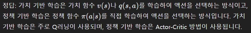 - 가치 기반 학습과 정책 기반 학습의 차이점을 설명하시오.