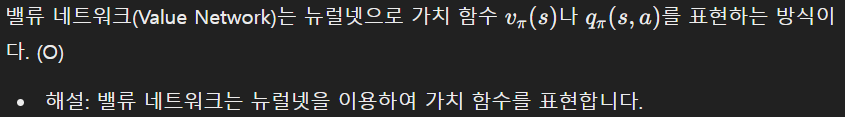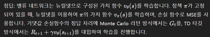 - 해설: 밸류 네트워크는 뉴럴넷을 사용하여 가치 함수를 학습하며, Monte Carlo 리턴과 TD 타깃 방식을 통해 손실 함수를 최적화합니다.