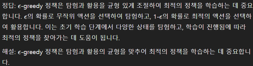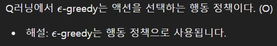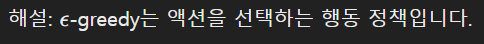 - 해설: (\epsilon)-greedy는 액션을 선택하는 행동 정책입니다.
