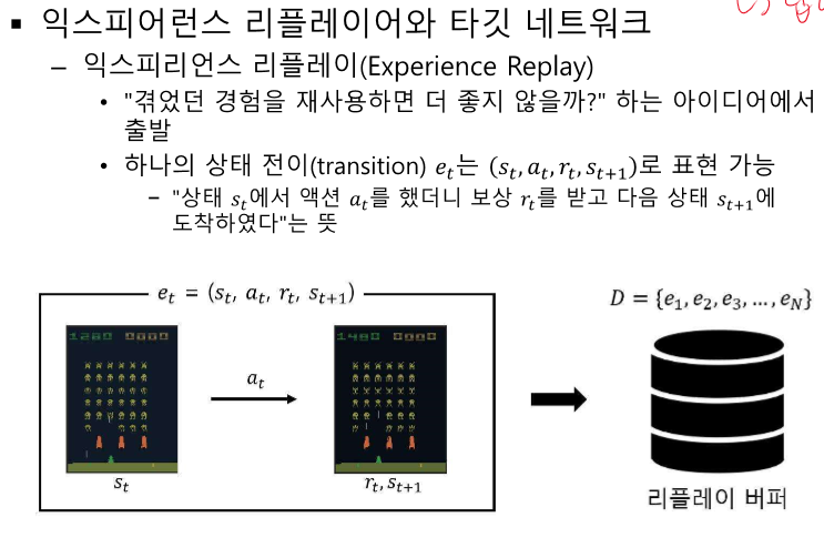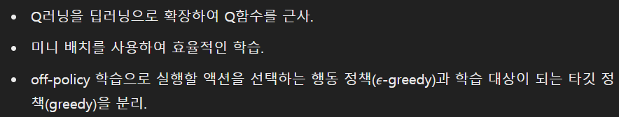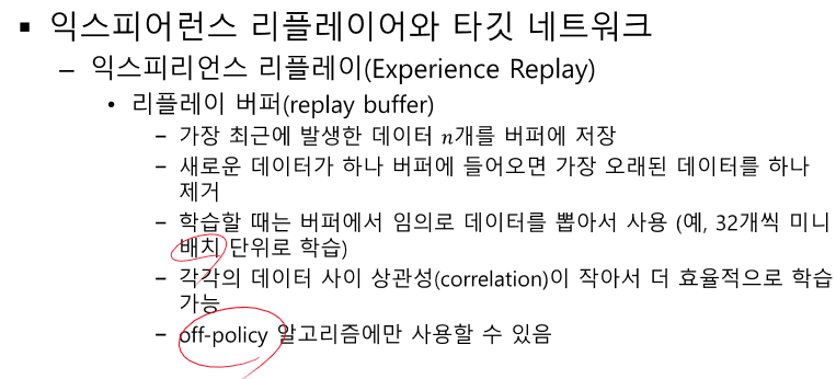 - 리플레이 버퍼에 최근 데이터를 저장하고, 학습 시 임의로 데이터를 뽑아서 사용.