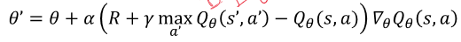 4. Q에 대해 입실론 그리디를 통해 액션 a 선택 -> a 실행 후 리워드와 s' 관측 -> s'에서 greedy를 통해 a' 선택 -> 파라미터 업데이트 -> s= s'